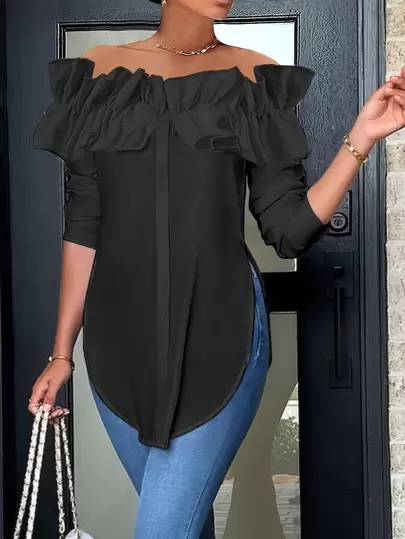 Women's Off Shoulder Button Front Long Sleeve Blouse - Black - View 1