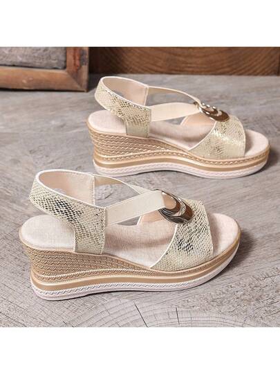 Women's Plus Size Metal Buckle Espadrille Wedge Sandals, Open Toe Roman Style, Suitable For Summer - Beige - View 1