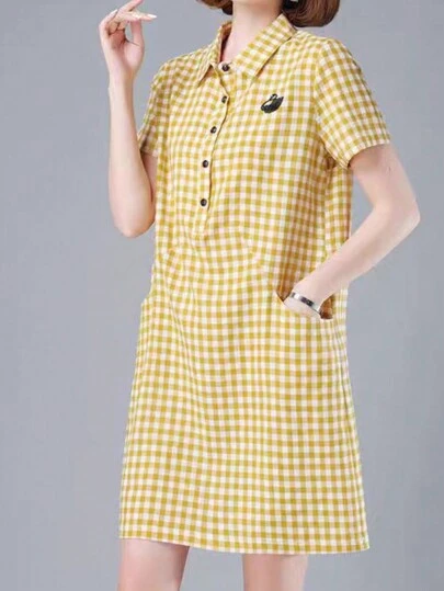 Women's Point Collar Short Sleeve Front Button Pocket Plaid Mini Dress - Yellow - View 1