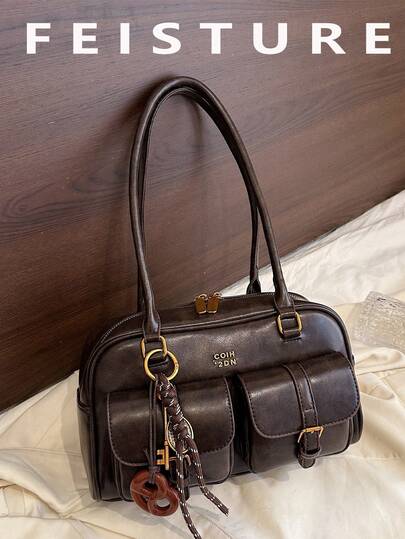 Women's Retro Solid Color PU Leather Shoulder Bag, Multi-Pocket Design, Large Capacity, With Detachable Pendant, Street Japanese Style Handbag - Coffee Brown - View 1