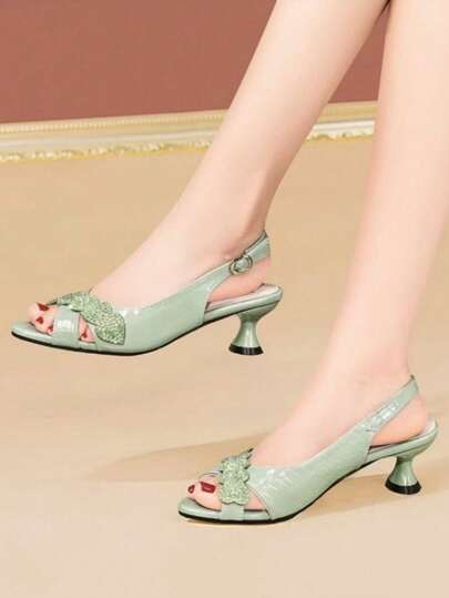 Women's Rhinestone High Heel Sandals, Fashion Buckle Closure Comfortable Chunky Heel Sandals - Green - View 1