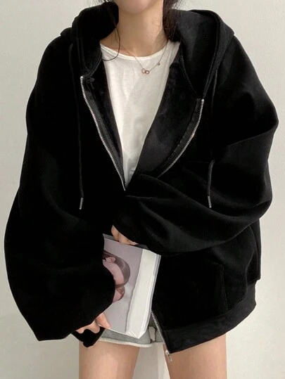 Women's Solid Color Raglan Sleeve Long Sleeve Casual Loose Drawstring Fleece Hoodie, Autumn/Winter - Black - View 1