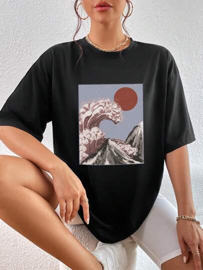 SHEIN EZwear Women's Wave Pattern Printed Short Sleeve T-Shirt - Black - View 1