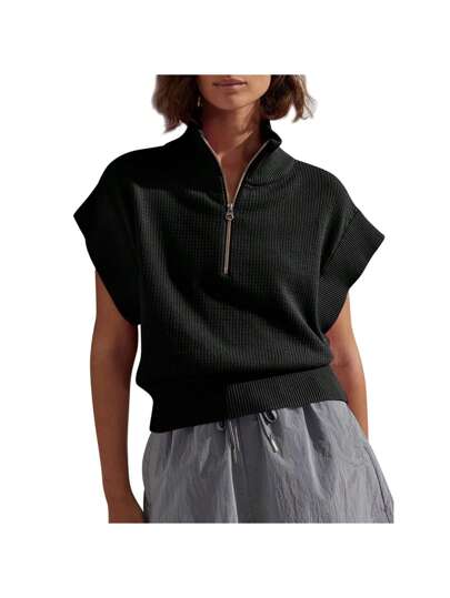 Womens Short Sleeve Cropped Knit Tops Half Zip Cap Sleeve Lightweight Oversized Sweater Vest - Black - View 1