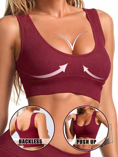 Women's Sports Bra, Seamless Bra, Padded Bralette, Backless Bra, Breathable Soft Bandeau, Comfortable Wireless Bra, Women's Lingerie - Burgundy - View 1