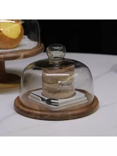Wooden Cake Rotating Stand With Glass Dome Cover, For Dessert Display - Brown - View 1