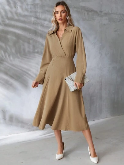 SHEIN BIZwear Wrap Neckline Long Sleeve Dress - Brown - View 1