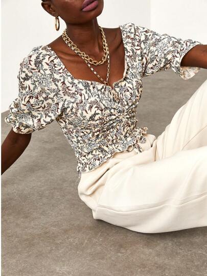 XHAN Shirred Knitted Blouse - Ecru - Multicolor - View 1