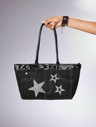 ROMWE Grunge Punk Y2K Retro Punk Star Studded Belt Women Shoulder Bag Multi-Pocket Large Capacity Rivet Tote Bag - Black - View 1