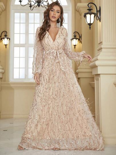 YISIKADO Plunge Neck Belted Sequin Maxi Dress - Champagne - View 1