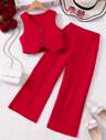 2pcs/Set Girls Elegant Collar Bow Decor Long Sleeve Top And Wide Leg Pants, Fashion Autumn Outfit