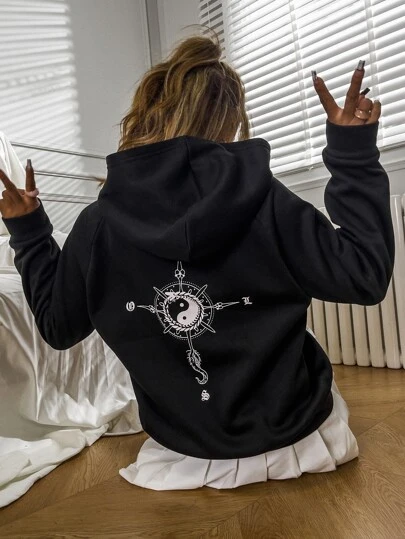 Yin & Yang Print Raglan Sleeve Hoodie - Black - View 1