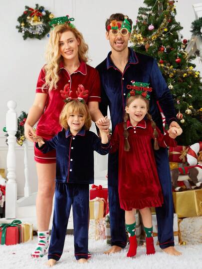 Boys' Velvet Contrast Color Homewear Suit, Family Matching Outfits Mommy And Me(4 Sets Are Sold Separately) - Navy Blue - View 1