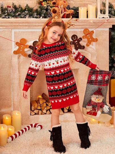 SHEIN Young Girl 1pc Christmas Pattern Sweater Dress - Red - View 1