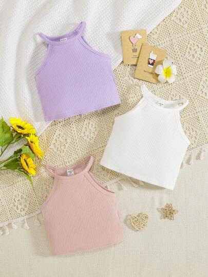 SHEIN Young Girl 3pcs Ribbed Knit Halter Top - Multicolor - View 1