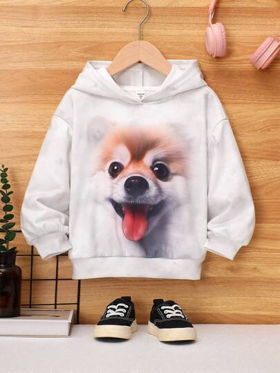 SHEIN Young Girl Dog Print Drop Shoulder Hoodie - White - View 1