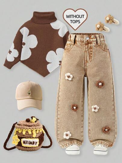 Young Girl Fashion Washed Stereo Floral Jeans - Khaki - View 1