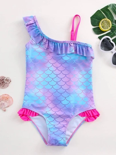 Young Girl Fish Scale Print Ruffle Trim One Piece Swimsuit - Multicolor - View 1
