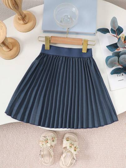 SHEIN Young Girl Pleated Elastic Waist Casual A-Line Skirt, Suitable For Spring & Summer - Royal Blue - View 1