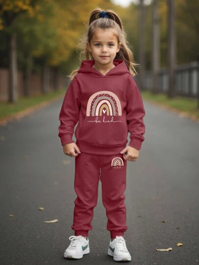 Young Girl' Rainbow Pattern Fashionable Comfortable Hooded Sweatsuit, School, Campus, College - Burgundy - View 1