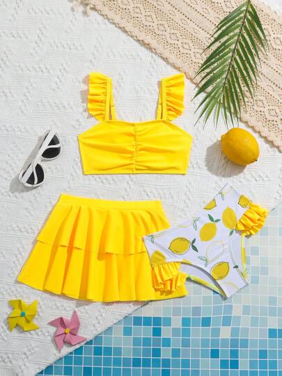 SHEIN Young Girl Two-Piece Bikini Set With Lemon Print & Ruffle Bikini Set Top, Matching Skirt Cover Up For Beach Vacation, Spring/Summer Summer Beach - Yellow - View 1