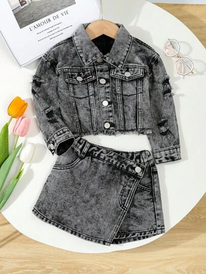 Young Girls Mini Distressed Black & Gray Denim Jacket + Denim Skirt Pants 2 Pieces Set - Black - View 1