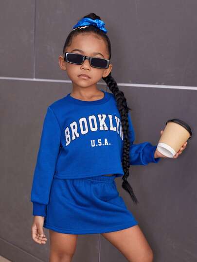 SHEIN Young Girl Letter Graphic Pullover & Skirt - Blue - View 1