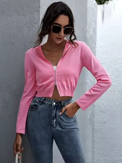 Zip Up Hooded Cardigan - Pink - View 1