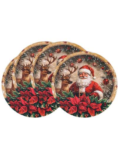 4pcs Merry Christmas Santa Claus Linen Round Placemats 15 Inch Reindeer Poinsettias Pattern Festive Winter Holiday Xmas Restaurant Kitchen Dining Room Table Decorations For Family Celebrations Party Decor Christmas Decorations For Home 2025 Gifts New Year 2026 Table Mat Ornament