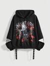 ROMWE Grunge Punk Casual Graphic Black Punk Street Chic Vintage Thorns Y2K Y3K Futuristic Tie-Dye Cross Print Black Zip-Up Graphic Pocket Sweatshirt For Women