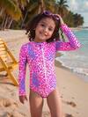 SHEIN Young Girls One-Pieces Cute Multi-Color Leopard Print Color Base, Butterfly Print Pattern, Knitted Fabric, Front And Middle Zipper, Long-Sleeved Sun Protection One-Piece Suit, One-Piece Leopard Print Butterfly Swimsuit, Fashionable, Casual, Exquisite, Elegant Lady, Suitable For Swimming, Suitable For Summer Vacation, Summer Beach, Seaside Swimming Pool, Swimming Pool, Summer Party, Leisure Vacation Girls Swimsuit Long Sleeve Rash Guard Girls Rash Guard With Zipper