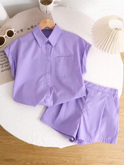 SHEIN Leap Crew Tween Girls' Vacation Casual Woven Solid Color Short Sleeve Shirt And Shorts Set, Spring/Summer - Mauve Purple - View 1
