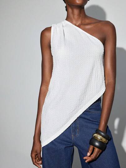 Maija Women's Summer Casual Versatile Solid Asymmetric Tank Top One Shoulder Top One Sleeve Top Asymmetrical Top One Shoulder Top Asymmetrical Top - White - View 1