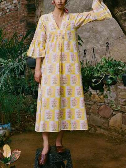 Womens 3/4 Puff Sleeve Floral Maxi Dresses Boho Summer Casual V Neck Long Flowy Swing Dress - Yellow - View 1