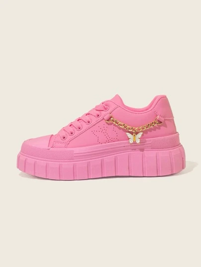 Sporty Skate Shoes For Women, Chain & Butterfly Decor Lace-up Front Sneakers - Pink - View 1