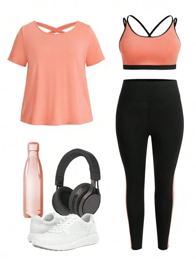 Easithlete Plus Size Criss Cross Back Sports Bra & Tee & Leggings Gym Clothes Workout Set Workout Women Set - Multicolor - View 1