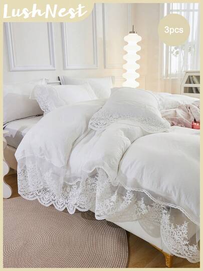 White Bedding Set Shabby Chic Farmhouse Bedding Quilt Cover White Wide Lace Decor Solid Colour Duvet Cover Set 3 Pcs Classic Lace Decor White Comforter Cover Super Soft Breathable Microfiber Duvet Cover For Boys&Girls 1 Duvet Cover With Zipper 2 Pillowcases No Comforter - White - View 6