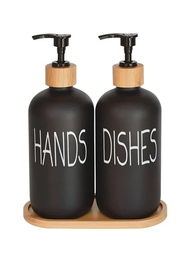 Black Glass Soap Dispenser Set. Hand Soap and Dish Soap Dispenser with Bamboo Tray. Vintage Soap Dispenser with Pump for Kitchen Sink and Bathroom. Stylish Permanent Labels (Matte Black) - Black - View 1