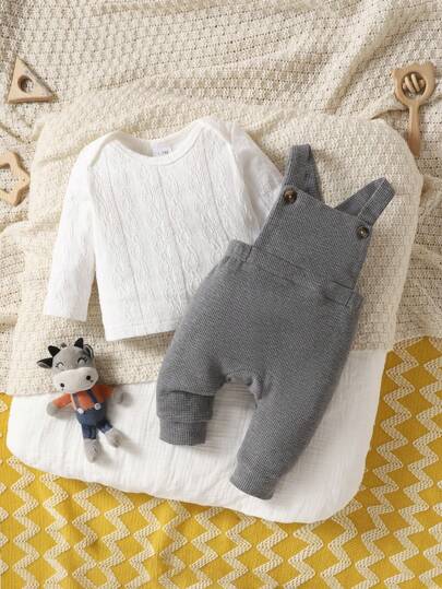 SHEIN Baby Boy Solid Tee & Overall Jumpsuit - Grey - View 1
