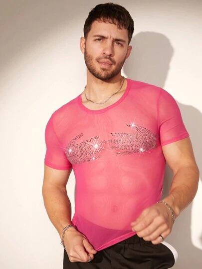 FeverCity Summer Men Sexy Slim-Fit Short Sleeve T-Shirt With Embellished Hand Design - Hot Pink - View 1