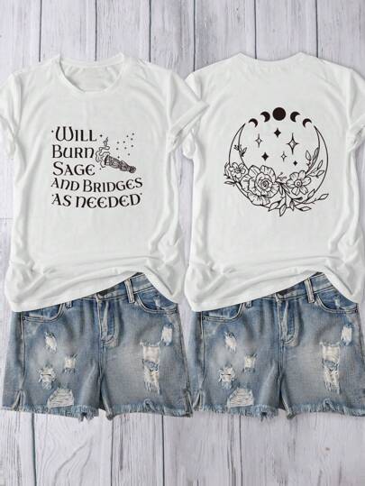 INAWLY Bohemian Vintage Women's T-Shirt, Moon Letter Print T-Shirt, Moon Flower T-Shirt, Summer Casual Women's Round Neck Short Sleeve Top WILL BURN SAGE AND BRIDGES AS NEEDED Graphic Tees Women Tops - White - View 1