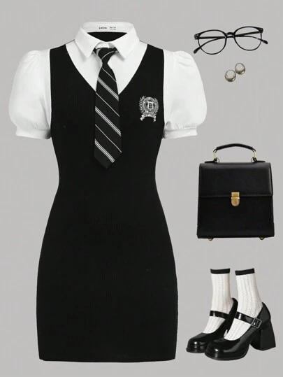 SHEIN Teen Girls Black And White 2 In 1 College Style Embroidery Tie Knit Back-To-School Season Casual Dress - Black and White - View 1