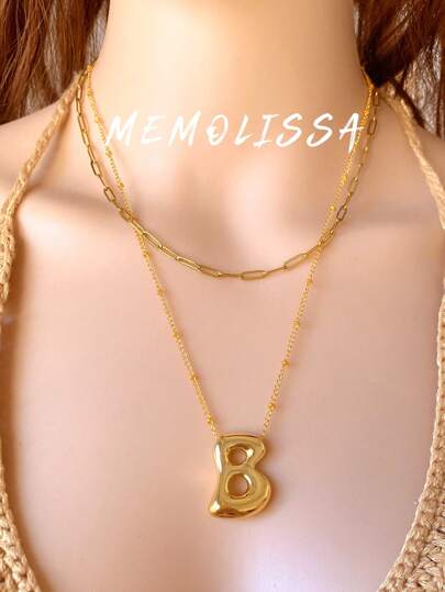 2pcs Simple & Fashionable Stainless Steel 26 Mirrored Fat Letter Double-Layer Necklace Set For Women, Suitable For Parties And Daily Wear - Yellow Gold - View 31