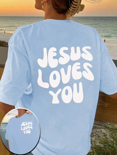 INAWLY Oversized Summer Beach Slogan Printed T-Shirt JESUS LOVES YOU Graphic Tees Women Tops - Blue - View 1