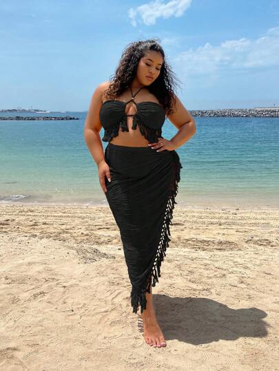 SHEIN SXY Plus Size Resort Wear Beach Vacation Outfits Vacation Outfits Vacation Clothes For Women Summer Clothes For Women Women's Textured Fabric Fringe Tassels High Side Slit Skirt And Crop Top Two Pieces Set For Vacation - Black - View 1