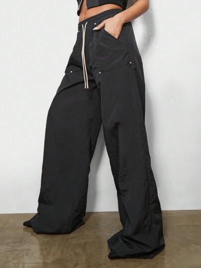 SUMWON WOMEN Nylon Wide Leg Cargo Pants High Waist Drawstring Parachute Pants Windbreaker Style Fall Winter Outdoor Streetwear Baggy Trousers With Rivets - Black - View 1