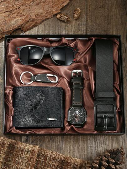 5 Pieces Men's Fashion Mechanical Style Leather Strap Quartz Watch Gift Box Set, Men's Gift, Gift For Friends - Black - View 1