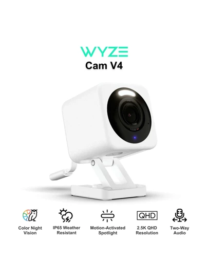 WYZE Cam V4, 2K HD Wi-Fi Smart Home Security Camera, Indoor/Outdoor Use, Pet/Baby Monitor, Motion Activated Spotlight/Siren, Enhanced Color Night Vision, 2-Way Audio, Local/Cloud Storage, Wired, White - View 1