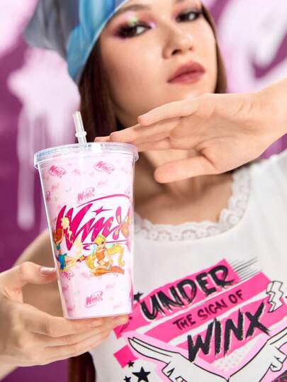 Winx Club X ROMWE A Double-Layered Cola Flat-Bottomed Cup Featuring A  Enchantix Character With A Built-In Straw, Against A Pink Background Adorned With Butterflies. - Clear - View 1