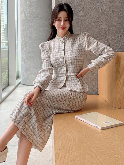 DAZY 2pcs Ladies Plaid Texture Front Button Long Sleeve Jacket And Skirt Elegant Set,Fall Clothes - Apricot - View 1